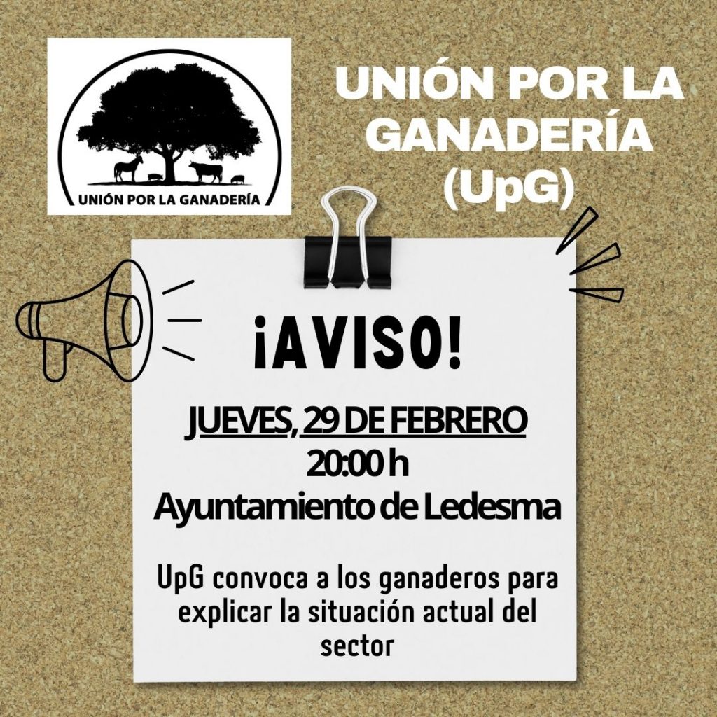 UpG anima a todos los ganaderos a participar en las próximas jornadas que se llevarán a cabo en las localidades de Alba de Tormes (1 de marzo a las 20:00h en el Hotel Cuatro Calzadas), Salamanca (4 de marzo a las 20:00h en la Cámara de Comercio, Salón de Actos), Ciudad Rodrigo (5 de marzo a las 12:00h en la Sala Uned), Lumbrales (5 de marzo a las 20:00h en el Centro Cultural), Béjar (6 de marzo lugar y hora pendiente de confirmar), Vitigudino (12 de marzo a las 12:00h en el Centro Cultural), La Fuente de San Esteban (12 de marzo a las 20:00h en el Club del Jubilado) y Vecinos (13 de marzo a las 20:00h lugar pendiente de confirmar).